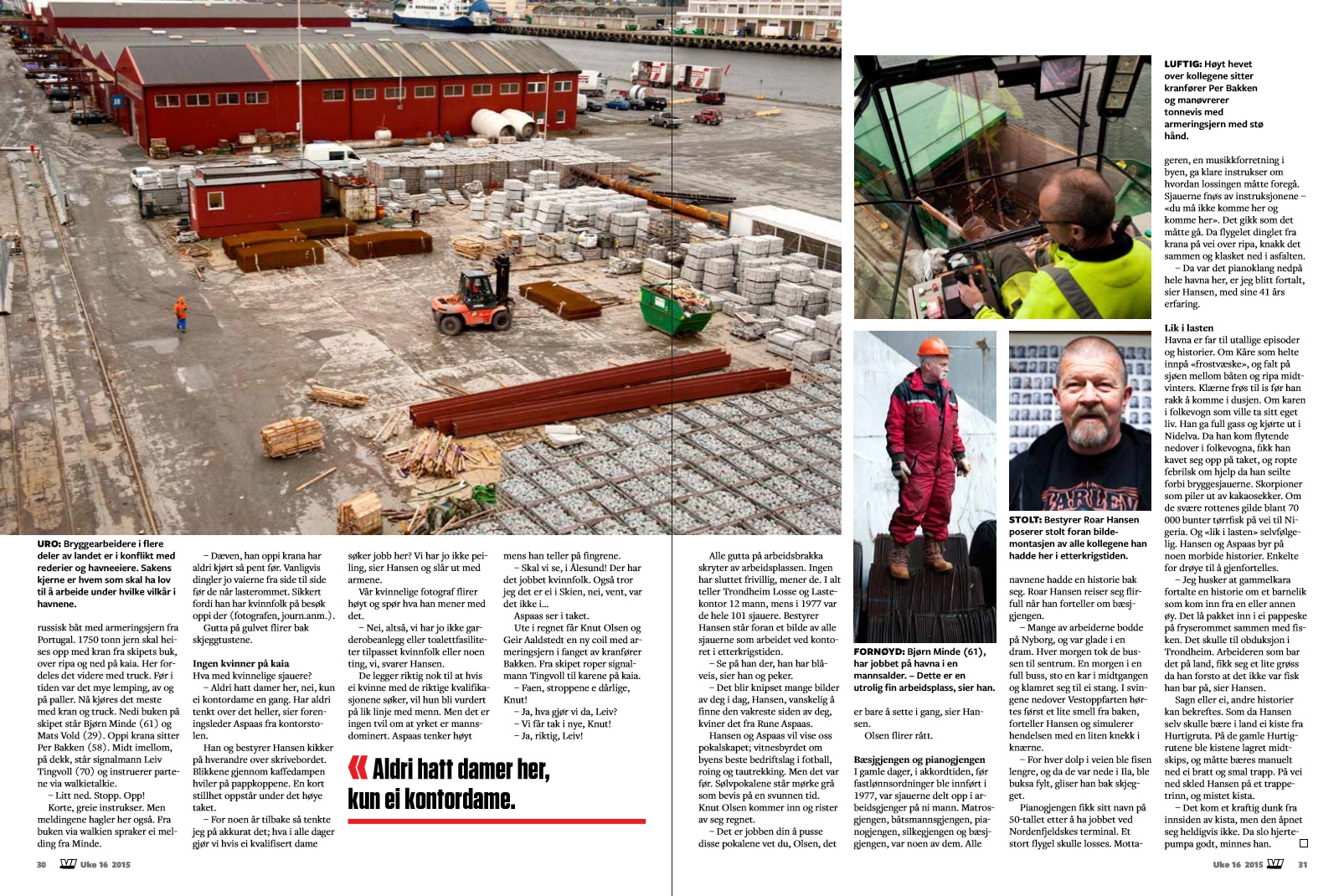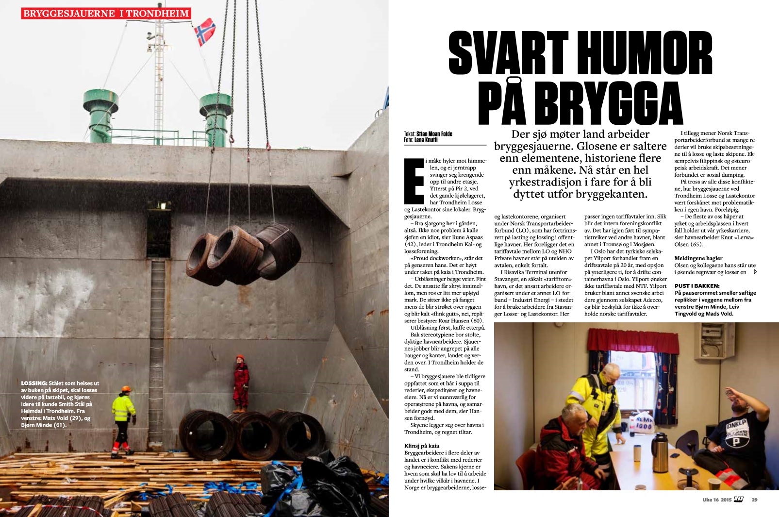 Fotograf Lena Knutli og jeg besøkte bryggesjauerne på havna i Trondheim. Havnekonflikter har pågått i flere norske byer i mange år, der sakens kjerne er hvem som har lov til å arbeide, under hvilke forhold. I Trondheim holder sjauerne organisert under Transportarbeiderforbundet stand mot markedskreftene, enn så lenge.