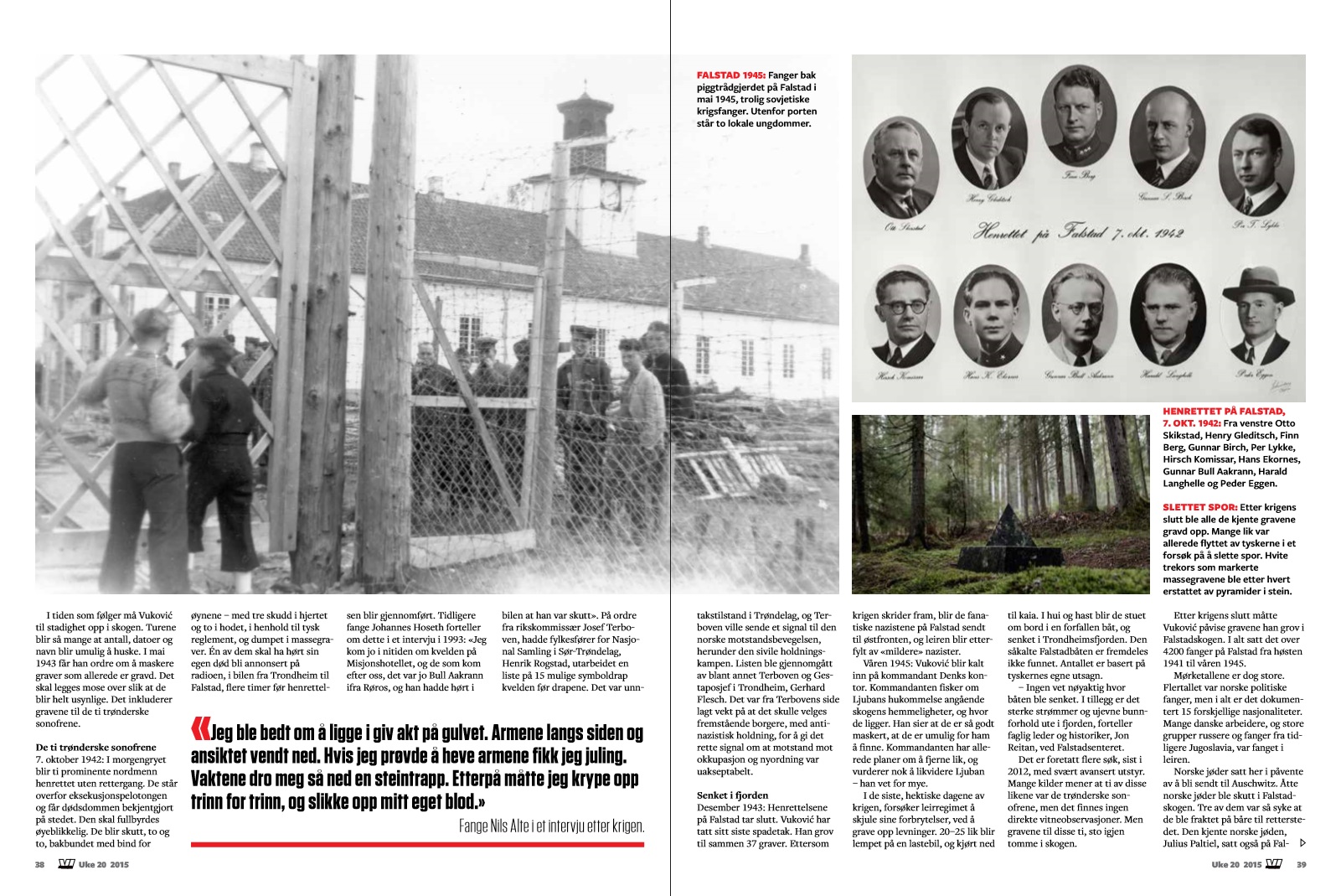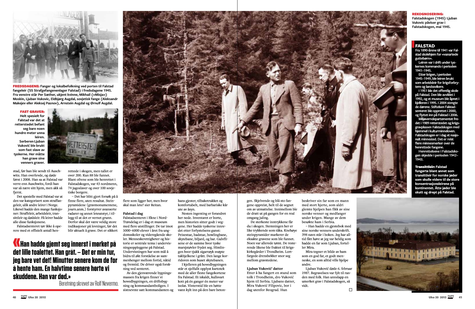 I 1942-1943 ble over 200 fanger bakbundet og skutt i Falstadskogen i Ekne i Nord-Trøndelag. Henrettet uten rettergang og dumpet i en massegrav. Blant disse var norske jøder, de trønderske sonofrene, ofrene i Majavatn-tragedien, og mange andre. Det tyske SS spredte frykt i leiren, og fremdeles ligger det sannsynligvis lik under skogbunnen. Den serbiske fangen Ljuban Vukovic ble tvunget til å grave de fleste gravene, og overlevde såvidt. Vi forteller litt av historien fra Falstad, gjennom hans øyne.