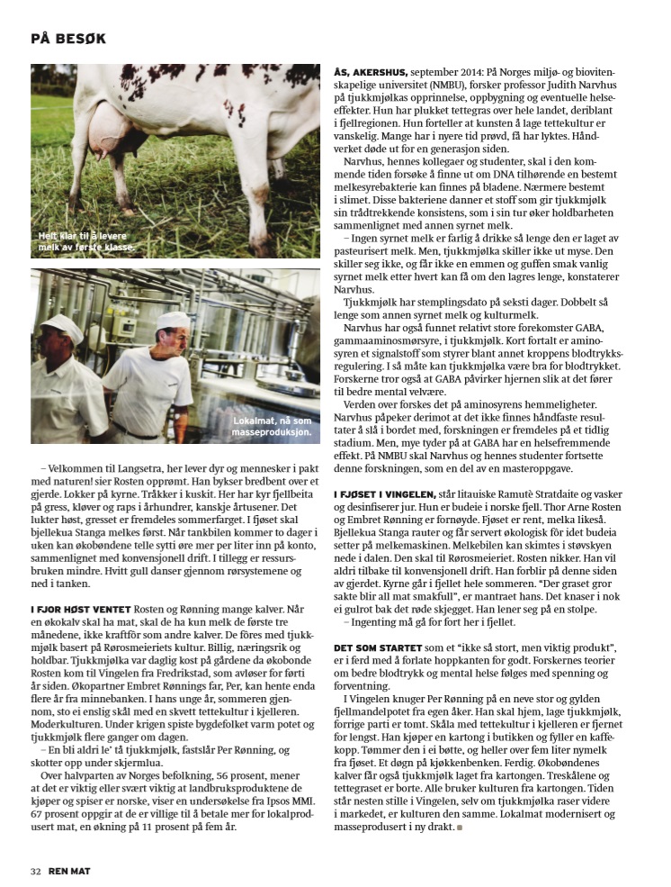Økologisk tjukkmjølk har 60 dagers holdbarhet, ifølge stempelet. Dobbelt så lenge som annen syrnet melk. Sannheten er at norsk lov krever en slik stempling, selv om produktet kan holde i månedsvis. Det har både historien og forskere bevist. I tillegg inneholder mjølka store forekomster av GABA – gammaaminosmørsyre, godt for den mentale helsen og blodtrykket, ifølge forsker. Photojournalist Marius Sunde Tvinnereim og jeg fulgte mjølka fra ekrene i fjellet, via meieriet, og ut til forbrukerne. Les saken i nåværende utgave av Ren Mat.