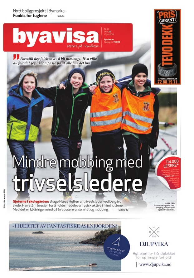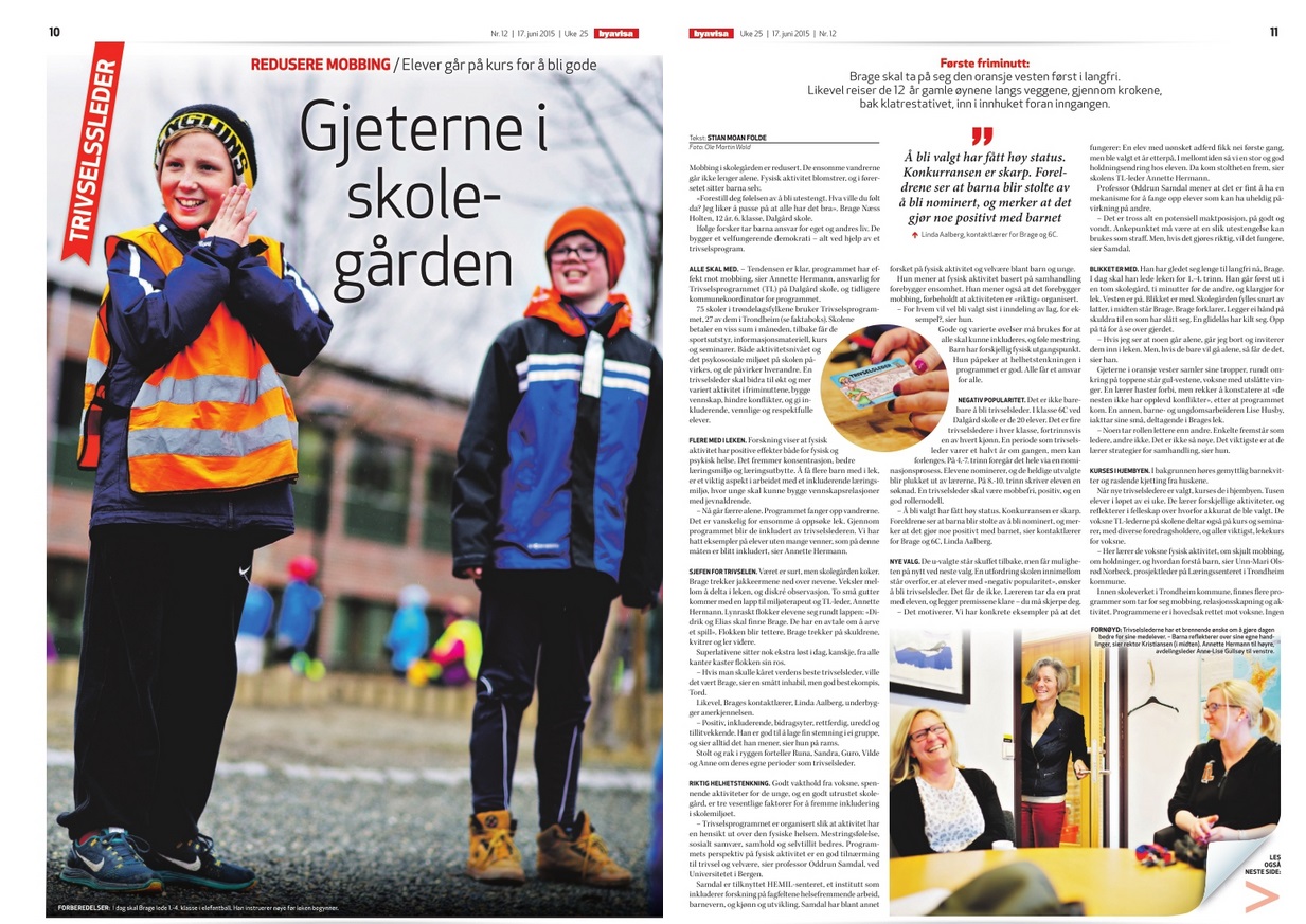 «Første friminutt. Brage skal ta på seg den oransje vesten først i langfri. Likevel reiser de tolv år gamle øynene langs veggene, gjennom krokene, bak klatrestativet, inn i innhuket foran inngangen. Mobbing i skolegården er redusert. De ensomme vandrerne går ikke lenger alene. Fysisk aktivitet blomstrer, og i førersetet sitter barna selv». Foto: Ole Martin Wold.